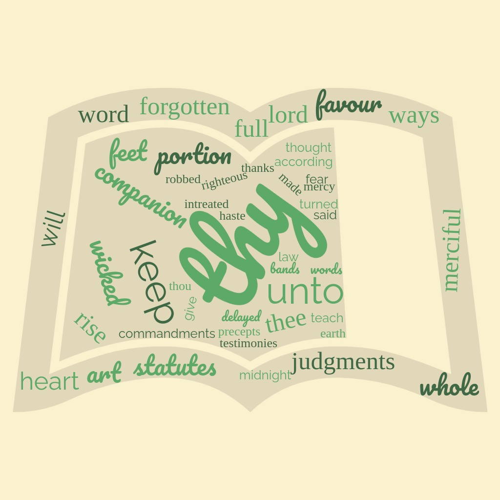 חלקי יהוה אמרתּי לשׁמר דּבריך׃ חלּיתי פניך בכל־לב חנּני כּאמרתך׃ חשּׁבתּי דרכי ואשׁיבה רגלי אל־עדתיך׃ חשׁתּי ולא התמהמהתּי לשׁמר מצותיך׃ חבלי רשׁעים עוּדני תּורתך לא שׁכחתּי׃ חצות־לילה אקוּם להודות לך על משׁפּטי צדקך׃ חבר אני לכל־אשׁר יראוּך וּלשׁמרי פּקּוּדיך׃ חסדּך יהוה מלאה הארץ חקּיך למּדני׃